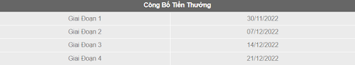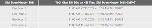 2. Thời Gian Khuyến Mãi bao gồm bốn (4) giai đoạn Khuyến Mãi, mỗi giai đoạn có thời gian bắt đầu và kết thúc, như bảng dưới đây (“Giai Đoạn Khuyến Mãi”):