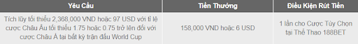 Là một trong 10 nhà cái tặng 100k miễn phí được nhiều người tham gia nhất, 188Bet tiếp tục triển khai chương trình KM mới mùa WC như sau: Đặt ngay bất kỳ trận đấu World Cup tại Thể Thao 188BET và nhận một (1) lần 158,000 VND tiền thưởng cho Cược Tùy Chọn!