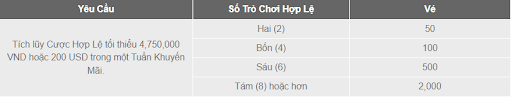 3. Thành Viên Hợp Lệ sẽ nhận được số Vé tham gia vào Rút Thăm dựa theo số Trò Chơi Hợp Lệ đã tham gia để tích lũy Cược Hợp Lệ trong mỗi Tuần Khuyến Mãi của Thời Gian Khuyến Mãi, như bảng dưới: