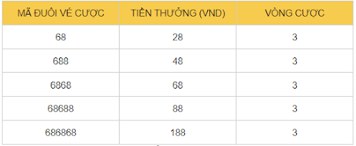 - Thành viên có vé cược tối thiểu 300,000 VND sẽ được nhận thưởng tương ứng như sau: